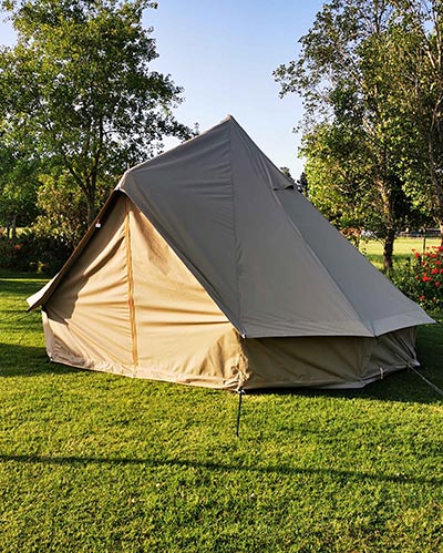 Sleeps 2 people - 5m x 3m bell tent + king sized mattress with base + 2 pillows with covers + king sized duvet with cover + 1 carpet + 1 light + 1 entrance ground sheet + 2 bedside tables. Festival tickets not included.